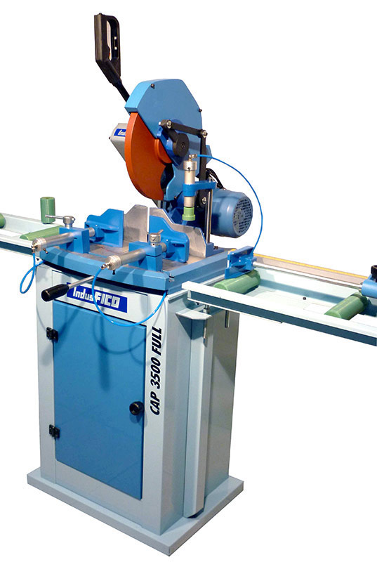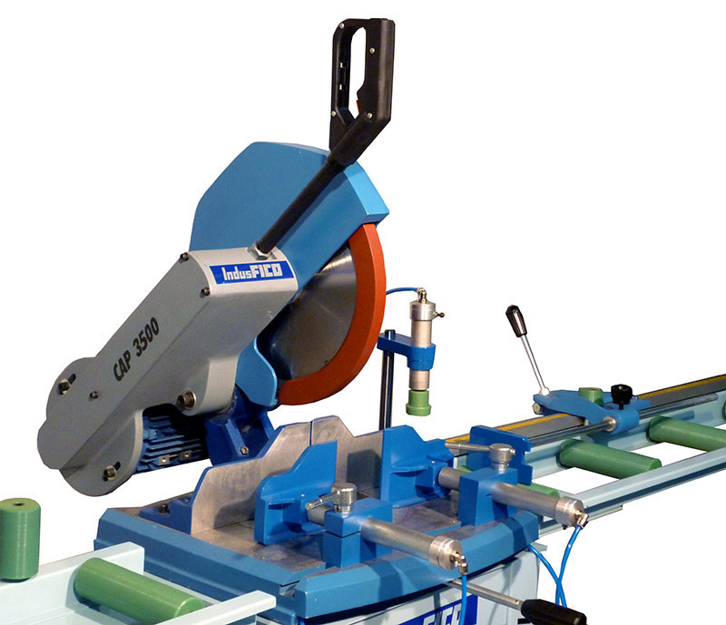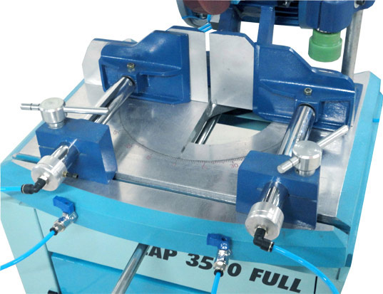 Cortadora semiautomática. Al bajar el cabezal para cortar, las morsas se cierran y comienza la lubricación en forma de neblina.